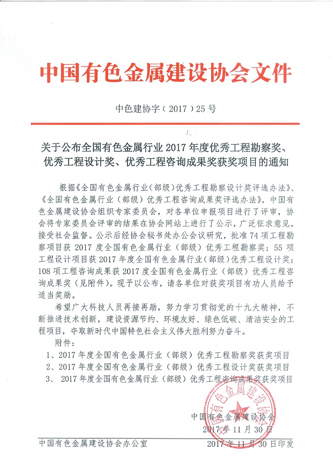 熱烈祝賀我公司兩項(xiàng)目榮獲全國(guó)有色金屬行業(yè)2017年度優(yōu)秀工程勘察獎(jiǎng)