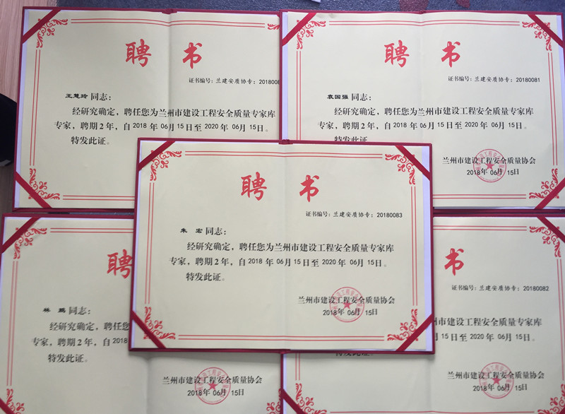 我公司于2018年4月申請(qǐng)成為蘭州市建設(shè)工程安全質(zhì)量協(xié)會(huì)會(huì)員單位。該協(xié)會(huì)為進(jìn)一步我市建設(shè)工程安全質(zhì)量管理水平,完善和規(guī)范工程安全質(zhì)量專家隊(duì)伍建設(shè),充分發(fā)揮專家在工程安全質(zhì)量檢查、咨詢、評(píng)價(jià)和指導(dǎo)等方面的作用,有效防范安全生產(chǎn)事故,更好地為企業(yè)和政府主管做好服務(wù),根據(jù)住建部37號(hào)令《危險(xiǎn)性較大的分部分項(xiàng)工程安全管理規(guī)定》我公司呂永平、朱宏、王惠玲、林鵬、袁國強(qiáng)被聘任為蘭州市建設(shè)工程安全質(zhì)量專家?guī)鞂<摇?/span>