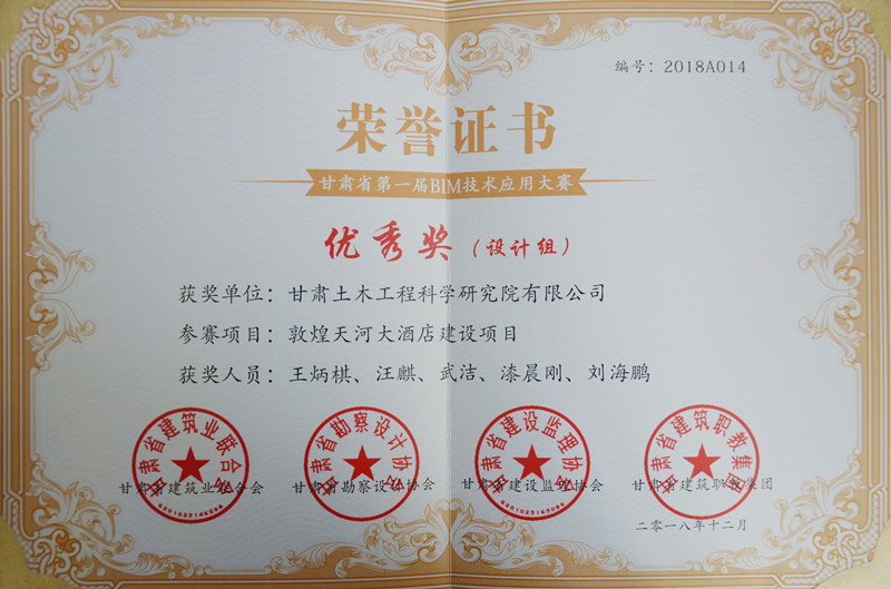 由甘肅省建筑業(yè)聯(lián)合會、甘肅省勘察設計協(xié)會、甘肅省建設監(jiān)理協(xié)會、甘肅省建筑職教集團主辦的甘肅省第一屆BIM技術應用大賽頒獎典禮于近日舉行,由我公司建筑設計中心王炳棋、汪麒、武潔、漆晨剛、劉海鵬幾位專業(yè)技術人員負責的“敦煌天和大酒店建設項目”BIM技術優(yōu)化設計獲得設計組優(yōu)秀獎。