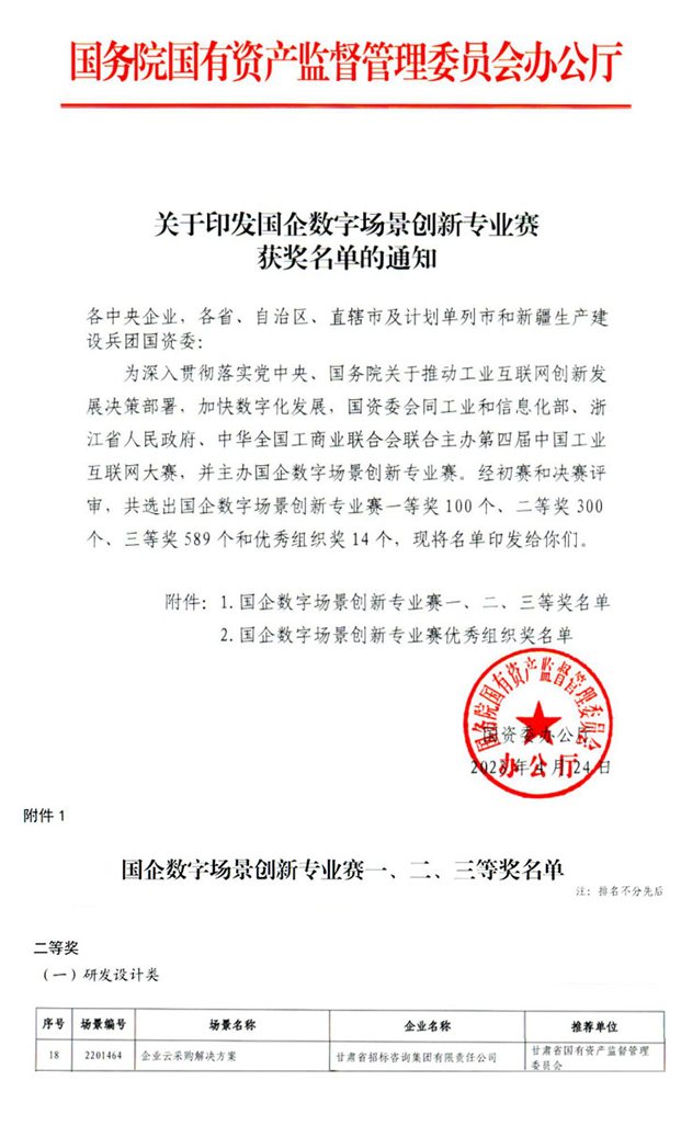 近日,國(guó)務(wù)院國(guó)資委公布了首屆“國(guó)企數(shù)字場(chǎng)景創(chuàng)新專業(yè)賽”獲獎(jiǎng)名單。甘肅工程咨詢集團(tuán)組織推薦的“甘招企業(yè)云采購(gòu)平臺(tái)”創(chuàng)新場(chǎng)景,在全國(guó)2007家參賽企業(yè)推薦的3277個(gè)場(chǎng)景中脫穎而出,榮獲二等獎(jiǎng)!
