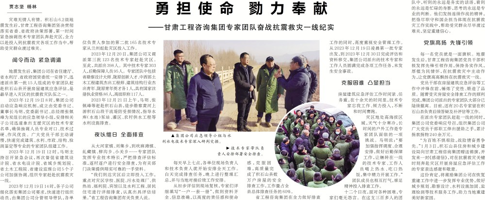 1月15日,《甘肅日報》第4版刊載《勇?lián)姑?勠力奉獻——甘肅工程咨詢集團專家團隊奮戰(zhàn)抗震救災(zāi)一線紀實》。該報道全面反映了集團公司黨委心系災(zāi)區(qū)、聞令而動的一系列擔當作為務(wù)實舉措,深度展現(xiàn)了專家團隊和干部職工向險而行、甘于奉獻的抗震救災(zāi)生動實踐,進一步凝聚起奮力奪取抗震救災(zāi)全面勝利的強大力量。