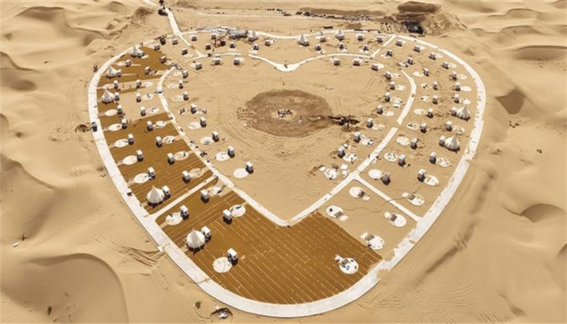 項目占地面積約13.33公頃,總建筑面積15952㎡。建設(shè)內(nèi)容包括游客服務中心、休閑中心及230座帳篷設(shè)施等。設(shè)計以優(yōu)美的異形建筑為中心,錯落有致的帳篷環(huán)繞四周,如繁星點綴在沙漠中,形成一道優(yōu)美的風景線。