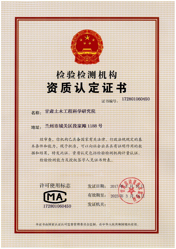 2003年初次通過甘肅省檢驗檢測機構(gòu)資質(zhì)認定,法律地位明確,組織機構(gòu)健全,人員能力、儀器設備配置、場所環(huán)境條件等均滿足檢驗檢測工作要求。具備建筑材料、巖土工程、工程結(jié)構(gòu)、建筑節(jié)能、室內(nèi)環(huán)境、鋼結(jié)構(gòu)檢測能力,通過了39類產(chǎn)品,736個參數(shù)的檢測能力認定。期間歷經(jīng)多次監(jiān)督評審、換證復評審,持續(xù)有效運行16年。