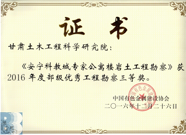 《安寧科教城專家公寓樓巖土工程勘察》(2016年度部級優(yōu)秀工程勘察三等獎(jiǎng))