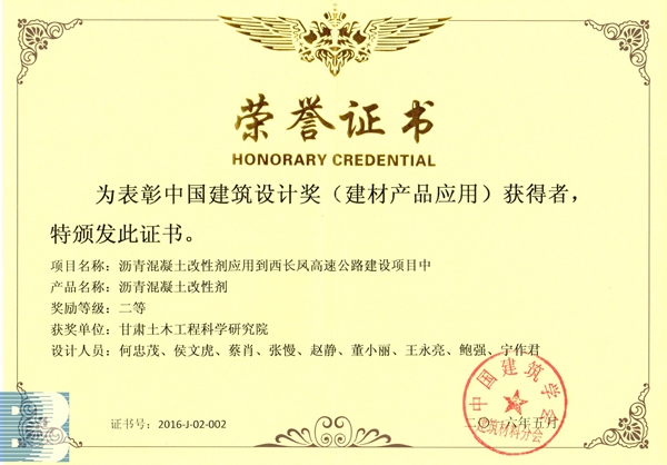 《瀝青混凝土改性劑應(yīng)用到西長鳳高速公路建設(shè)項目中》(2016年度中國建筑設(shè)計建材產(chǎn)品應(yīng)用二等獎)